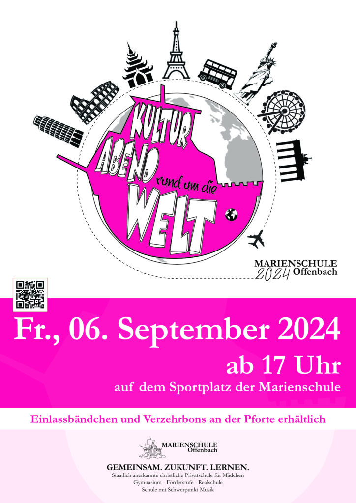 Nach längerer Pause ist es endlich wieder soweit: Am Freitag, 6. September 2024 findet von 17:00 bis 22:00 Uhr der nächste Kulturabend der Marienschule statt. Unter dem Motto “Rund um die Welt” erwartet uns Kulinarisches, Musik, Tanz und vieles mehr. Der Abend bietet einen wunderbaren Rahmen zur Begegnung zwischen Schülerinnen, Eltern, Lehreinnen und Lehrern, Freundinnen und Freunden der Marienschule. Herzliche Einladung, wir freuen uns auf Sie und euch!