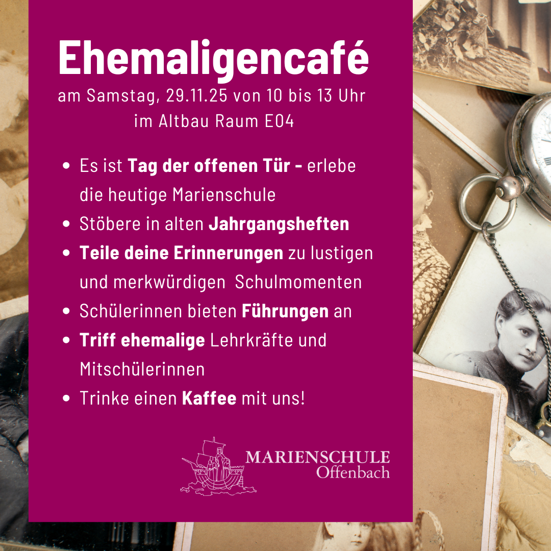 Zum zweiten Mal nutzen wir den Tag der offenen Tür um über verschiedene Generationen ehemaliger Marienschülerinnen hinweg in den Austausch zu kommen: Das Ehemaligencafe öffnet seine Türen und du bist herzlich eingeladen.